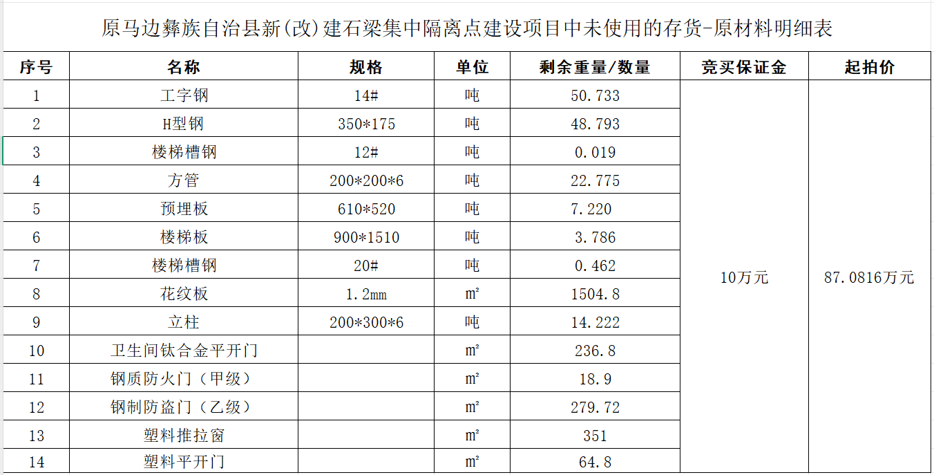 一、拍卖标的:原马边彝族自治县新(改)建石梁集中隔离点建设项目中未使用的存货-原材料,详情见《原马边彝族自治县新(改)建石梁集中隔离点建设项目中未使用的存货-原材料明细表》,标的整体拍卖,起拍价87.0816万元,竞买保证金10万元。