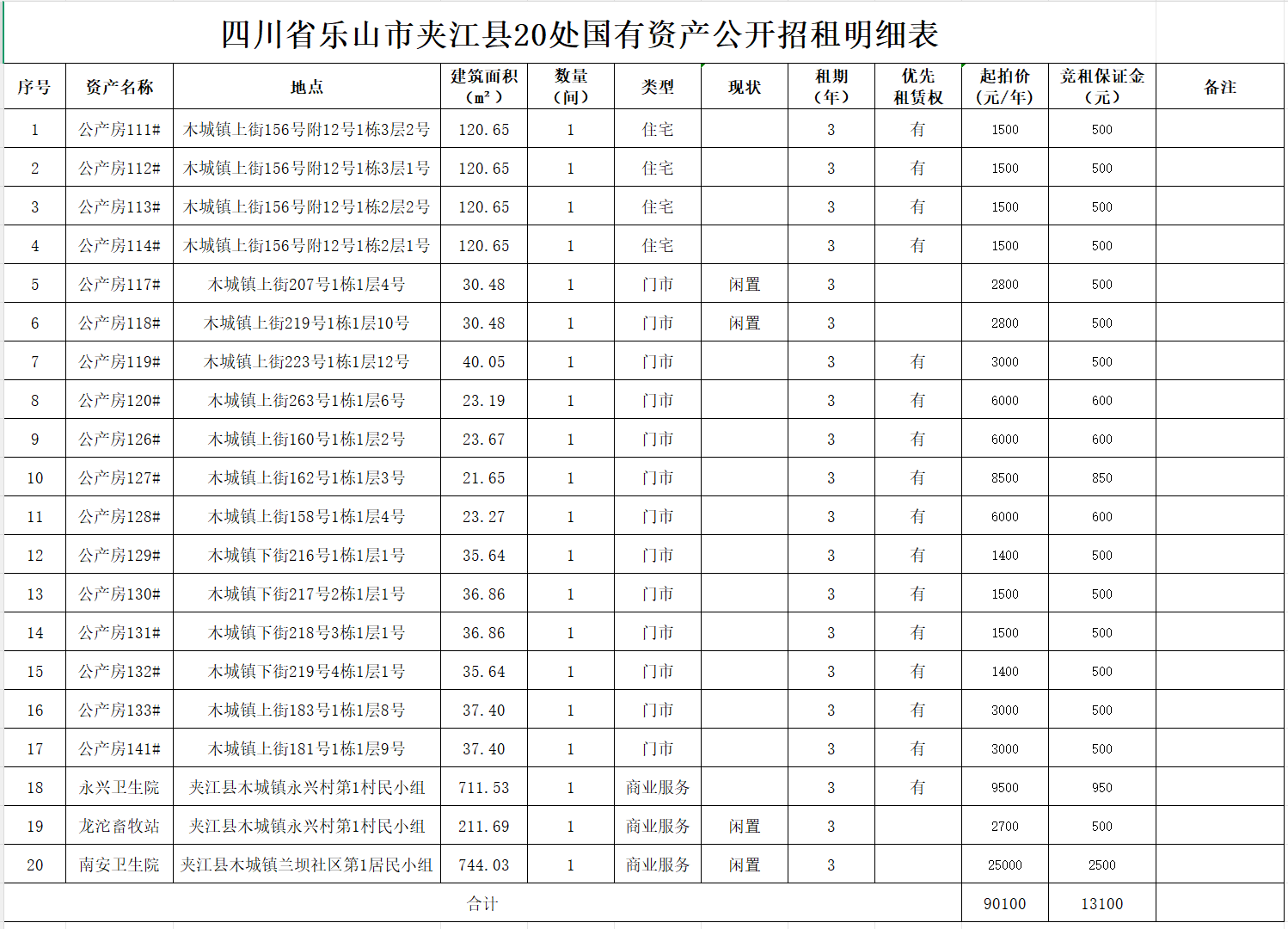 一、招租标的:四川省乐山市夹江县20处国有资产公开招租,标的分别位于木城镇五里社区上街及下街、兰坝社区第1居民小组、永兴村第1村民小组等地,标的具体位置、起拍价、竞租保证金等详见《四川省乐山市夹江县20处国有资产公开招租明细表》。